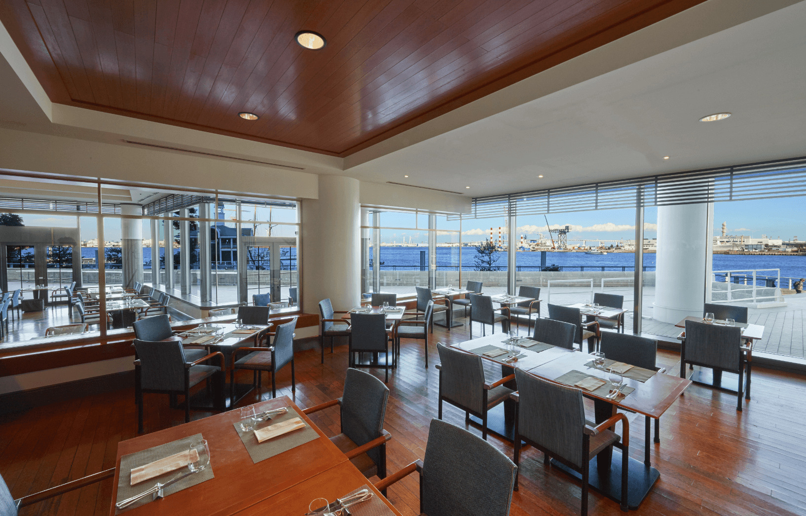 미나토미라이의 바다가 한눈에 들어오는 매장 내부는 오픈 키친으로 설계되어 활기차고 개방적인 분위기입니다. 인터컨티넨탈 호텔이 자랑하는 세계 각국의 미식을 오감으로 즐길 수 있습니다.