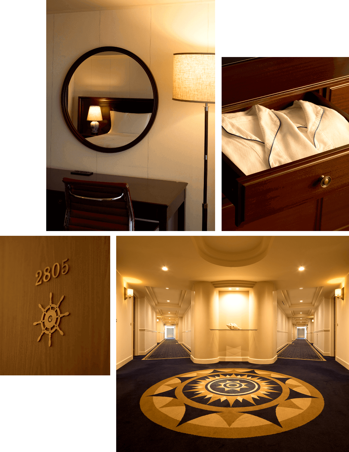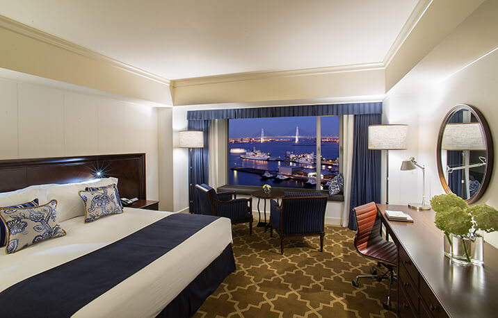 호화로운 여객선에서의 우아한 크루즈 여행을 모티브로 한 객실. 고급스럽고 어른스러운 공간에서 최고의 편안함을 경험하실 수 있습니다. 내부는 차분한 색조를 기조로 한 클래식한 디자인으로 꾸며져 있습니다. 미나토미라이의 야경을 한눈에 담을 수 있는 시티뷰, 그리고 베이 브리지와 요코하마항이 바라다보이는 하버뷰가 갖춰져 있어 어느 쪽으로든 요코마하 베이프런트만의 특별한 풍경을 감상할 수 있습니다.