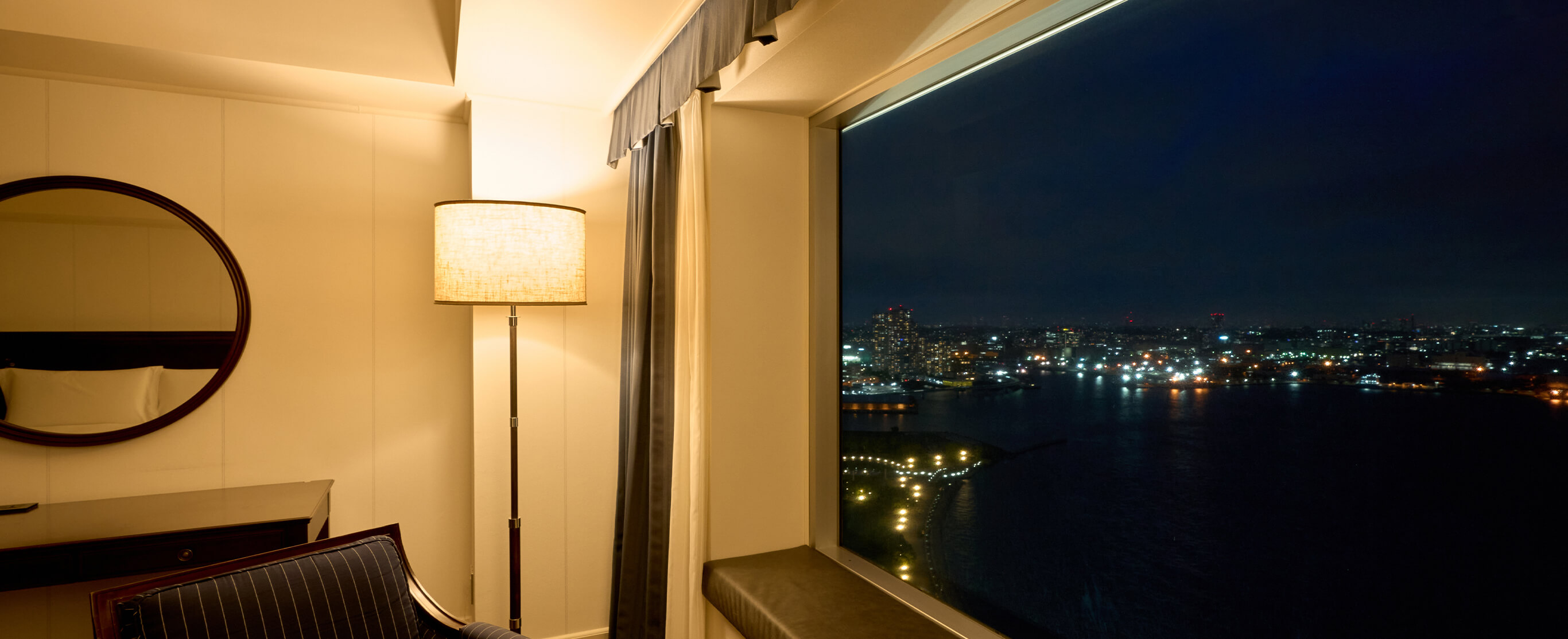 창 밖으로 눈을 돌리면 요코하마의 거리와 바다가 퍼져 마치 항구에 정박한 선상에 있는 것 같다. 맑은 날의 황혼에 하늘과 바다가 보라색에서 군청색으로 바뀌어 드라마틱한 파노라마로 압도된다. 한밤중 조용한 해수면에 보름달이 비치는 경치를 만날 수 있다면 그것은 마법 같은 시간. 이 경치를 바라보고 싶어서, 기념일에는 이 호텔을 예약해 버리는 것이다.