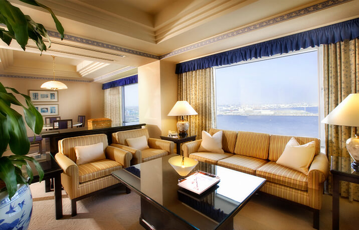 고층에 위치한 스위트룸. 넓은 객실에서는 베이 브리지를 비롯한 요코하마항이 한눈에 들어오는 하버뷰, 그리고 요코하마 시내와 대관람차의 일루미네이션이 아름답게 빛나는 시티뷰를 모두 감상할 수 있습니다. 특히 이 객실의 자랑 중 하나인 욕실은 바다를 바라보며 행복한 배스 타임을 즐길 수 있는 최고의 휴식을 선사합니다.